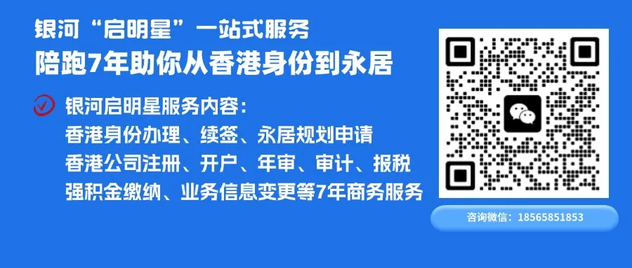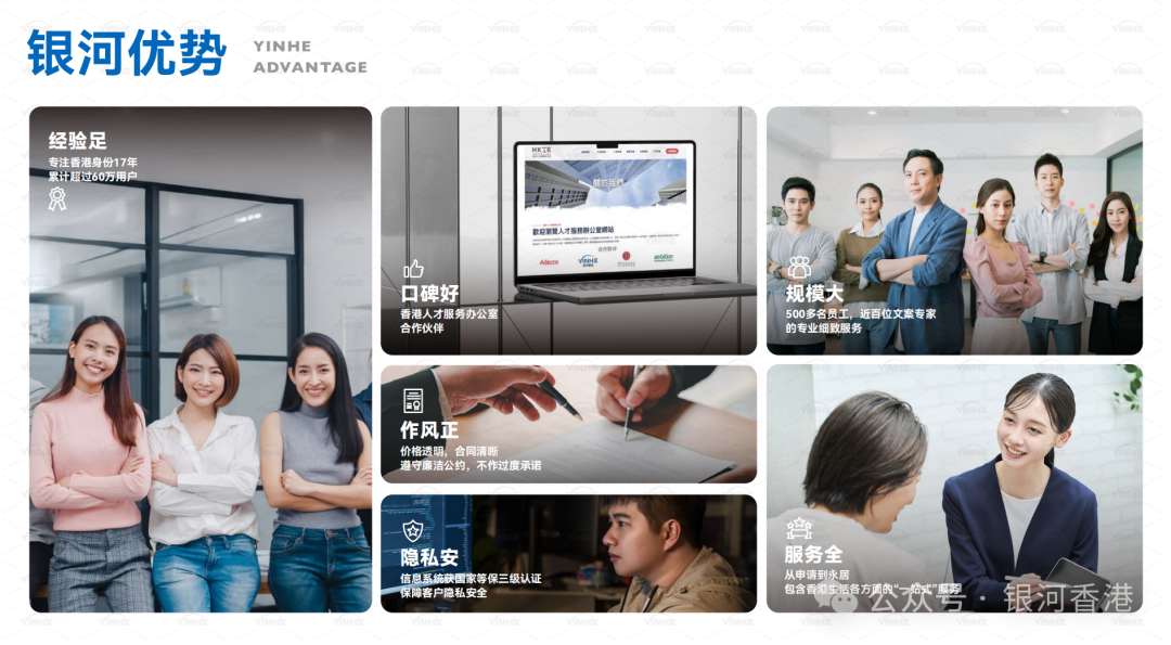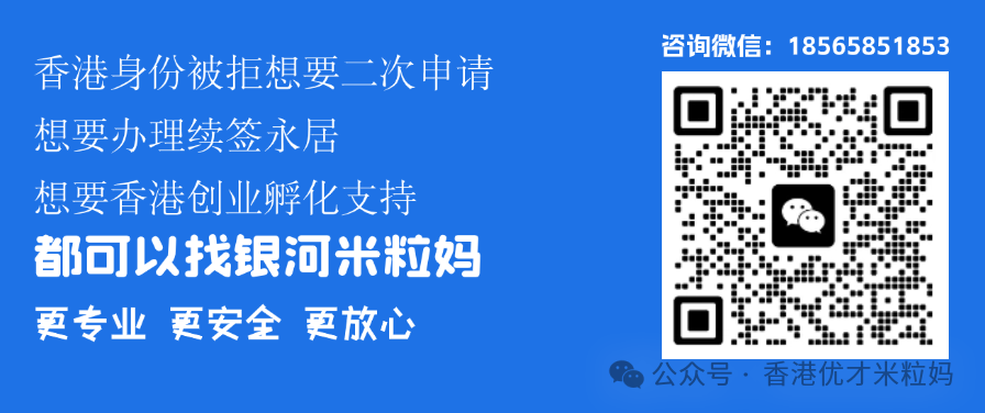 这些产品包括香港优才、高才通A类、专才、留学申请到永居的5万/6.1万身份类产品,申请永居、从续签到永居、从获批到永居阶段的产品、银河生意星、事业星、启明星、星企航、星陪伴等“星系列”创业产品。 下文我会详细介绍这几个产品的服务项目和流程,也可以加我的微信详细咨询。 如果你还没申请香港身份,不妨在线评估下自己能否申请,只需10s就知道自己适合哪种途径,如果已获批,对身份续签、永居、创业、择校等感兴趣可以加我微信咨询↓↓↓不少曾经diy被拒客户,或者已经获批客户都转过来找银河协助申请香港身份,或者香港身份后续服务。 X先生, X先在其他机构后续服务得不到保障,转银河服务2022年,X先生对比多家机构报价后,选择某公司的5万元申请优才服务到永居套餐。2023年初x先生优才获批后, 却由于线上预约抢不到号,迟迟无法办理香港身份证。X先生要求该公司帮忙,但始终无法得到解决,了解后发现,原来该公司在香港并没有身份后续服务团队,自然难以提供真正的香港身份后续服务。后经朋友介绍,找到了银河集团。银河近百人的香港生活服务团队,不仅很快帮 X先生解决了抢号问题,还派专人陪同X先生到入境处办理,让X先生一家顺利拿到香港身份证。X先生经过此事,X先生对银河的服务大加赞赏,果断追加3万元办理银河的续签+转永居服务套餐,x先生的太太也感慨,当初如果直接选择银河的6.1万元永居无忧套餐,反而还能省下2万多元钱。01) 丰富的申请经验:银河集团拥有17年的香港身份申请经验,积累了超过60万用户,能够处理高难度案例,确保申请的高成功率。02)公司规模大:公司拥有500+名员工,其中包括近百位文案专家,提供专业的细致服务。03)价格公正透明和合规操作:银河集团严格遵守合规要求,合同条款清晰,价格公正透明,不进行过度承诺,确保客户权益。04)良好的口碑和客户评价:作为香港特区政府人才服务办公室的合作伙伴,银河集团以“以客户为中心”的服务理念,赢得了高客户满意度和推荐率。05)先进的信息安全系统:银河集团自主研发的数字化信息系统获得国家等保三级认证,保障客户隐私安全,防止信息泄露。06)银河拥有强大的一站式服务能力:提供从身份申请到永居的全流程“一站式”服务,银河不仅为您提供香港身份办理服务,还提供香港身份续签、永居、香港中小学插班、香港创业孵化、香港商务、房产、生育等服务,确保客户在香港生活的各个方面都能得到满足。如果你还没申请香港身份,不妨在线评估下自己能否申请,只需10s就知道自己适合哪种途径↓↓↓ https://pages.galaxy-immi.com/evaluation/62?pla=v-gw-yinhegw&spreadword=V25012401