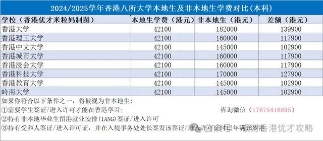 以下是港八大2024年2025年的学费清单,可以看出本地生和非本地生平均学费差距每年在10万以上。4年下来,差距达到40~60万。