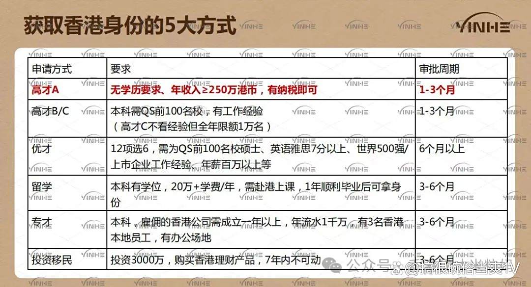 不同的方式适合不用的人群。如果你的年收入达到250万或者全球199所合资格大学本科毕业,那么可以走高才通;如果你打分超过6,可以选择香港优才计划,新版优才门槛大大提高,港府已经帮你筛掉了大部分竞争对手,如果符合赶紧申请,不要拖到明年了,如果名额收紧那真的就来不及了。 如果你足够有钱通过香港投资入境计划办理香港身份也可以,门槛3000万,购买房产也算。