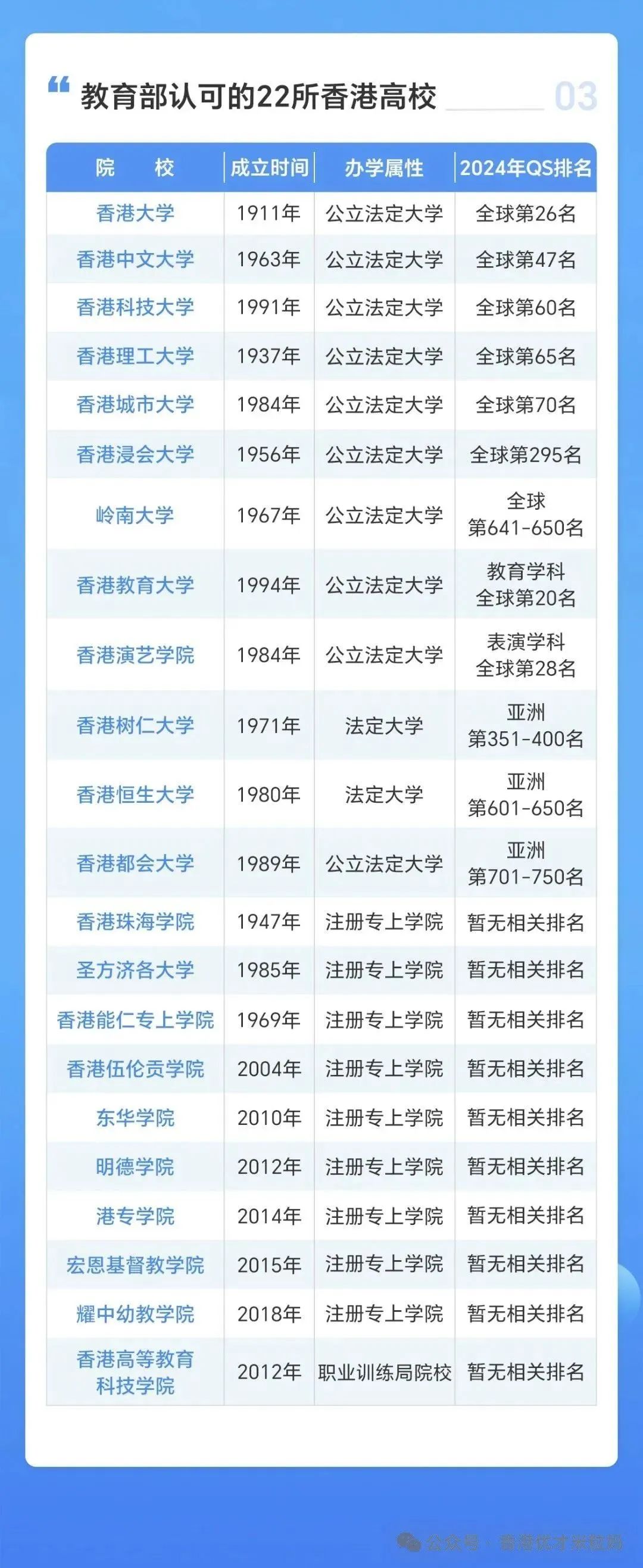香港大概有40所公立和私立的高等院校中,并不是所有的学校都被内地认可。目前国家教育部认可的香港高校,总共只有22所。建议大家报考时,最好选择下面这份名单里的大学报考,不然辛辛苦苦拿到的学历,回来内地就等于废纸一张。