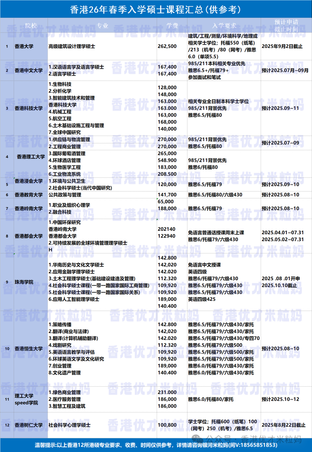 为大家制作了一张,香港26年春季入学硕士课程汇总表,可以点击查看大图。