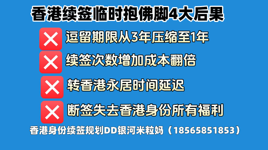 建议及时建立与香港工作关联,越早越好,千万不要临近续签节点再建立与香港工作关联。临时抱佛脚风险比较大,逗留期限会被压缩,本来可以续3年,结果只拿到1年,甚至更短的时间,导致续签次数增加,续签成本大幅度增加,另外还会导致转永居时间延长。