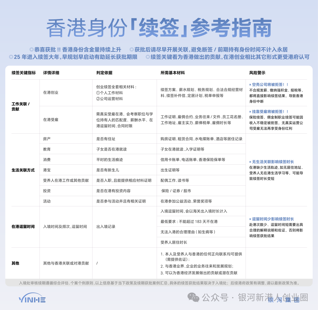 ②工作上,港府会考虑申请人在香港企业的雇佣合同期限、薪酬福利、工作经济效益及留港时间等③开办业务上,港府对于公司情况也有严格审核要求,包括但不限于业务营运及发展的情况,例如营业额、财政资源、投资金额、在本地开设的职位数目、业务带来的经济效益,以及申请人在港的居留时间等。现在港府对于来港人才要求越来越高,想要成功续签香港身份并没有那么简单,更何况香港身份续签成功≠能拿到永居身份,还需满足永居申请条件。