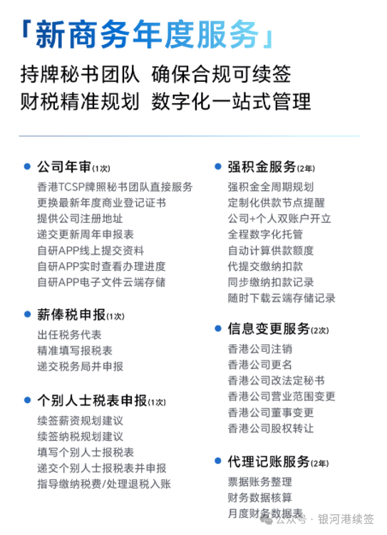 2、新商务服务年度:配备专业持牌秘书团队全程跟进,为企业提供从合规审查到续签指导的一站式保障,同时结合财税精准规划方案与数字化管理系统,助力企业实现高效运营与可持续发展。