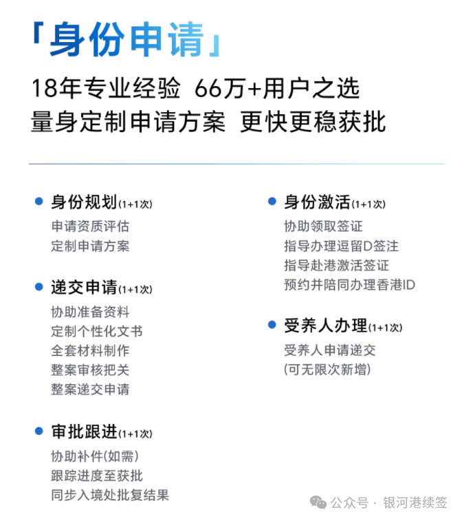 1、身份申请:银河凭借18年香港身份申请领域的专业深耕经验,已成为66万+用户信赖的机构,通过一对一量身定制高效申请方案,助力客户以更快速度、更稳保障成功获批香港身份。