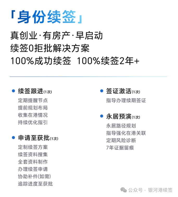 2、身份续签:银河提供身份续签专属服务,通过“真创业”项目落地、房产配置支持及提前规划启动的全方位方案,打造续签0拒批保障体系,已实现100%成功续签率且续签期限稳定达2年及以上。