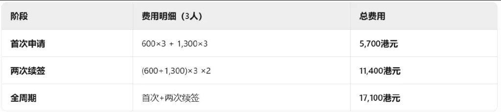 ✅续签阶段:香港身份通常需要续签2-3次才能满足7年“通常居住”要求,每次续签都需支付官方费用(1900港元/人/次)。此外,为证明与香港的联系,会产生在港生活成本(如租房、生活、子女教育),或在港工作、创业的成本。