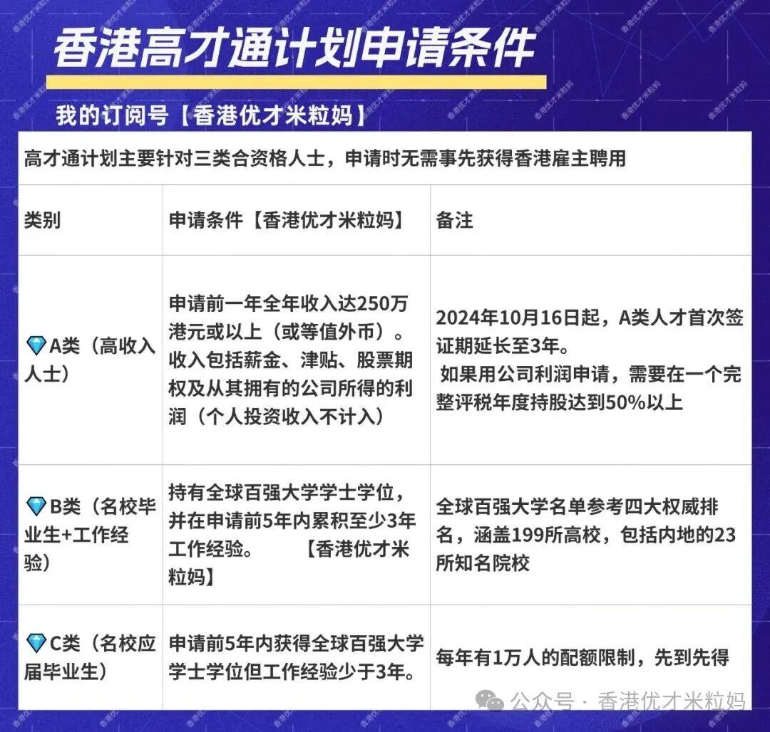 高才通计划主要针对三类合资格人士,高才通A、B、C类。高才通A类主要针对高收入人士,年收入达到250W,高才通BC类主要针对名校毕业生。