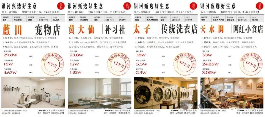 盈利数据:中等规模店铺月营收约3万港币,净利润超2万港币,回本周期约12-18个月左右。