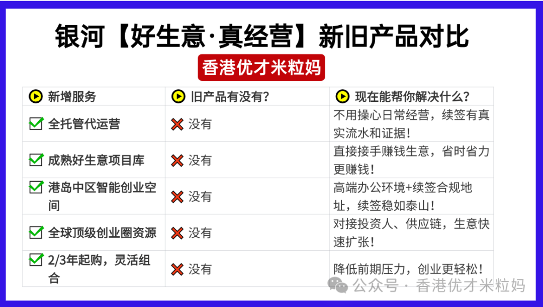 重磅!银河集团【好生意·真经营】新产品升级:新旧服务全对比、价格更优、案例实证,香港创业续签全链路赋能