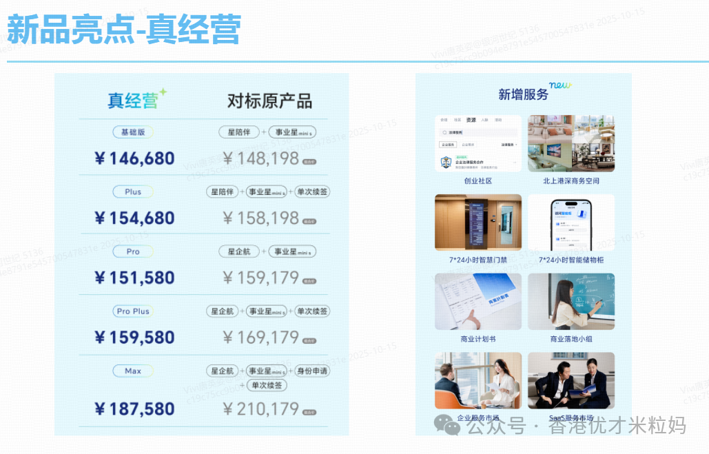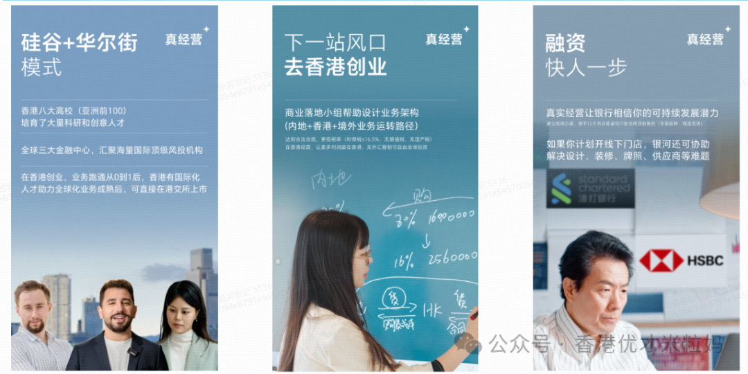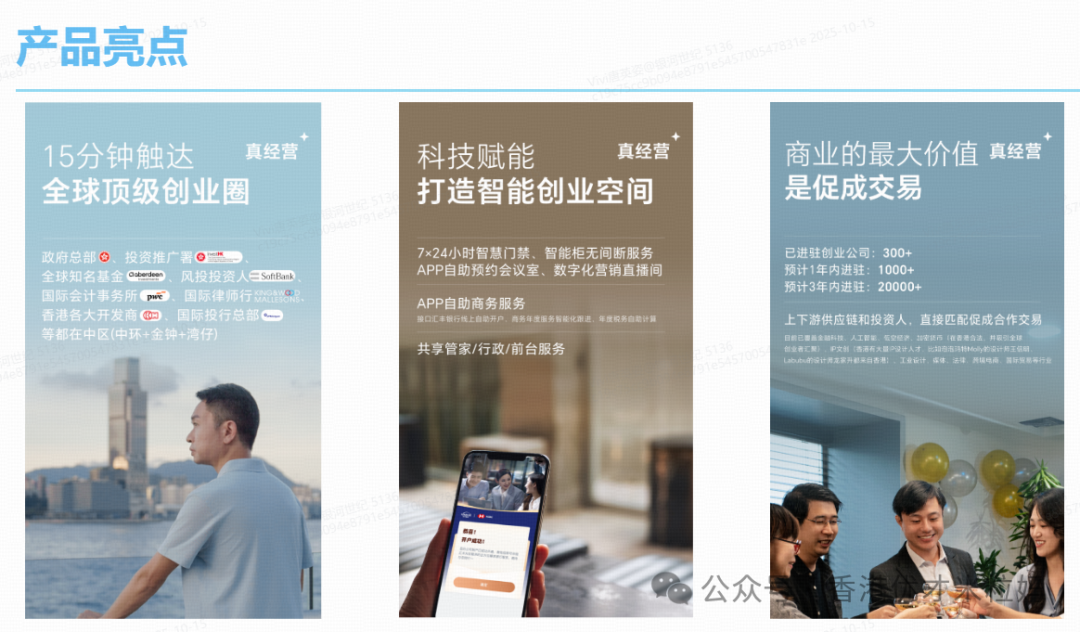 “真经营”:通过商业落地小组全程陪跑(覆盖内地-香港-境外业务路径)、智能创业空间(含合规办公地址)及高净值创业圈资源对接,帮助客户从0到1落地真实业务,避免“空壳公司”风险。
