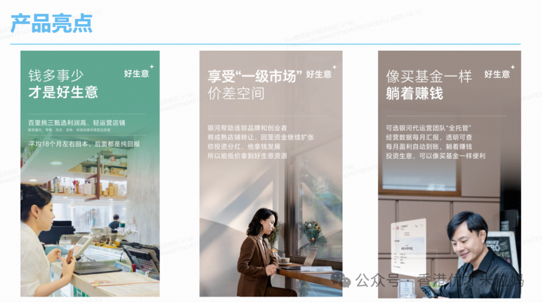 “好生意”:优选的成熟项目(如汉堡店、便利店)本身具备稳定盈利潜力,客户通过代运营或自主经营,平均18个月左右即可回本,部分项目还可获得银河66万+用户流量扶持,进一步提升营收;