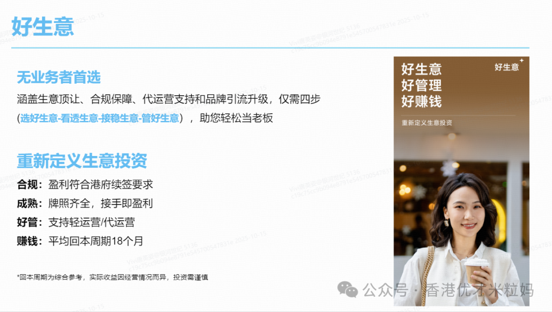 “好生意”:提供牌照齐全、模式成熟的成熟项目(如餐饮、零售、智能设备店铺),客户可直接接手运营,且所有项目均满足“真实地址+真实流水+真实经营”三要素,严格对标入境处续签审查标准。更有全托管代运营服务,从日常管理到营销引流全程托管,异地客户也能稳控经营,确保续签时有充足的证据链支撑。