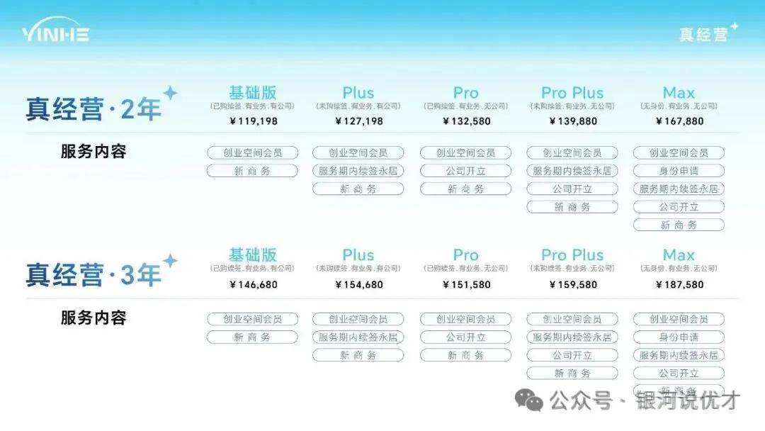 银河真经营有多个服务套餐,适合各种业务需求的人群,比如有业务+无公司、有公司+有业务、无业务+无公司等等,大家可以根据自身需求来选择合适产品。