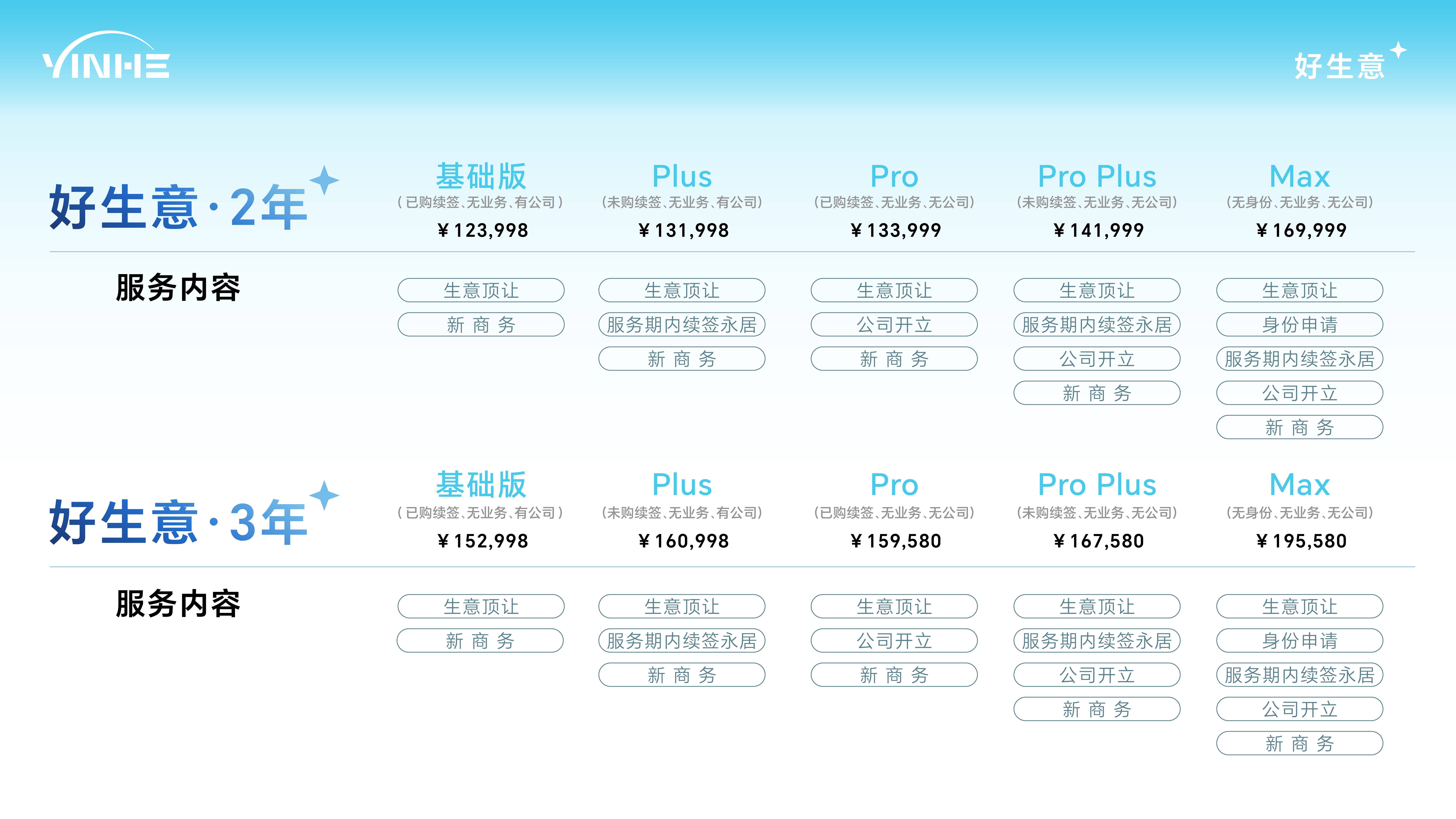 银河好生意同样有多个服务套餐,比如有业务+无公司、有公司+有业务、无业务+无公司等等,大家可以根据自身需求来选择合适产品。
