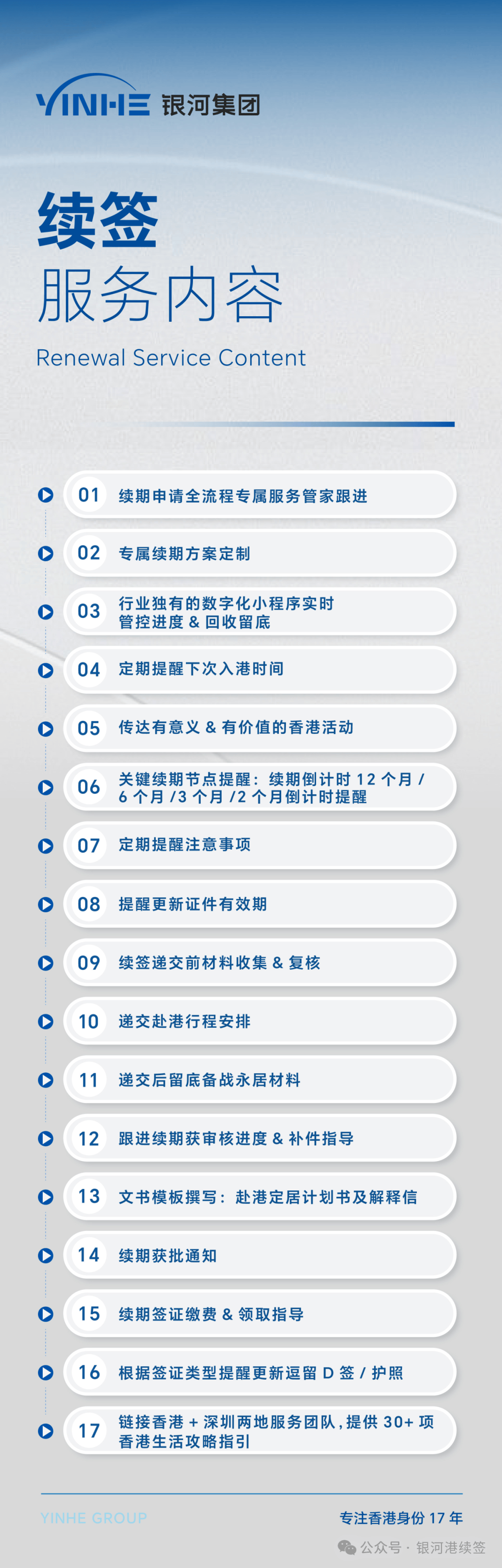银河集团作为拥有18年香港身份服务经验的机构,可以为你提供一站式的续签解决方案,除了香港身份申请外,银河集团还提供续签、永居、教育、创业、做生意、房产投资等全方位后续服务。这些服务确保了客户在获得香港身份后,能够顺利融入香港社会,享受香港的各项福利和便利。