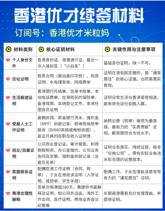 续签:需证明“通常居住”(租房合同、强积金、纳税记录)及“稳定收入”,长期离港需合理解释。