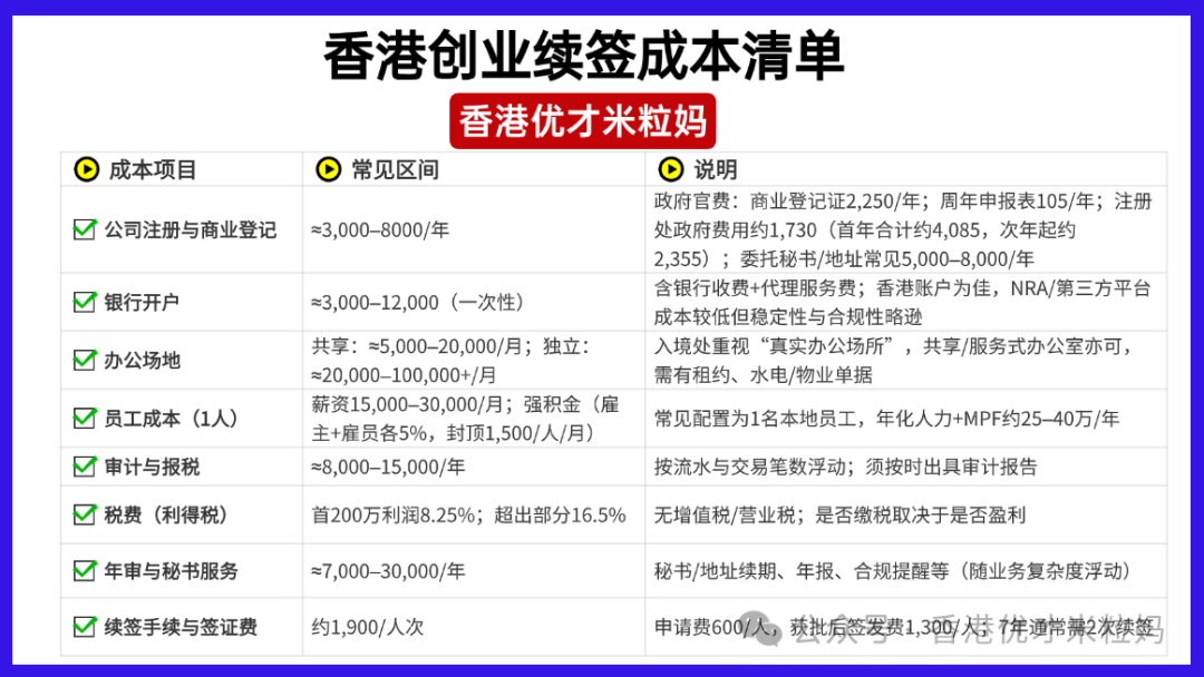 米粒妈建议:香港创业续签成本较高,如果你打算通过创业续签身份,需要提前做好创业规划以及成本控制,优先做“可审计的痕迹”,包括规范合同、发票/收据、银行流水、员工MPF、办公场地租约与照片、网站/名片/宣传物料等。可以选择共享办公加上1名本地员工并按时审计报税,通常就能满足“真实运营”的核心核查点。