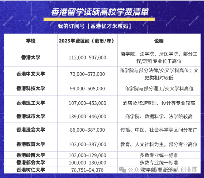米粒妈提醒:港八大(港大、港科大、港中文等)学费普遍高于非八大,但排名和就业认可度也更高,建议根据预算和目标权衡!
