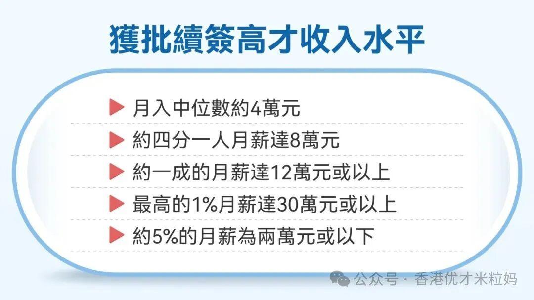 高才获批者不仅专业能力强,收入也相当不错。留港高才的月薪中位数约4万港元,其中顶尖1%人群月收入甚至超过30万,10%高于12万,还有25%在8万左右。高收入不仅带来强劲消费,也贡献了可观的税收。