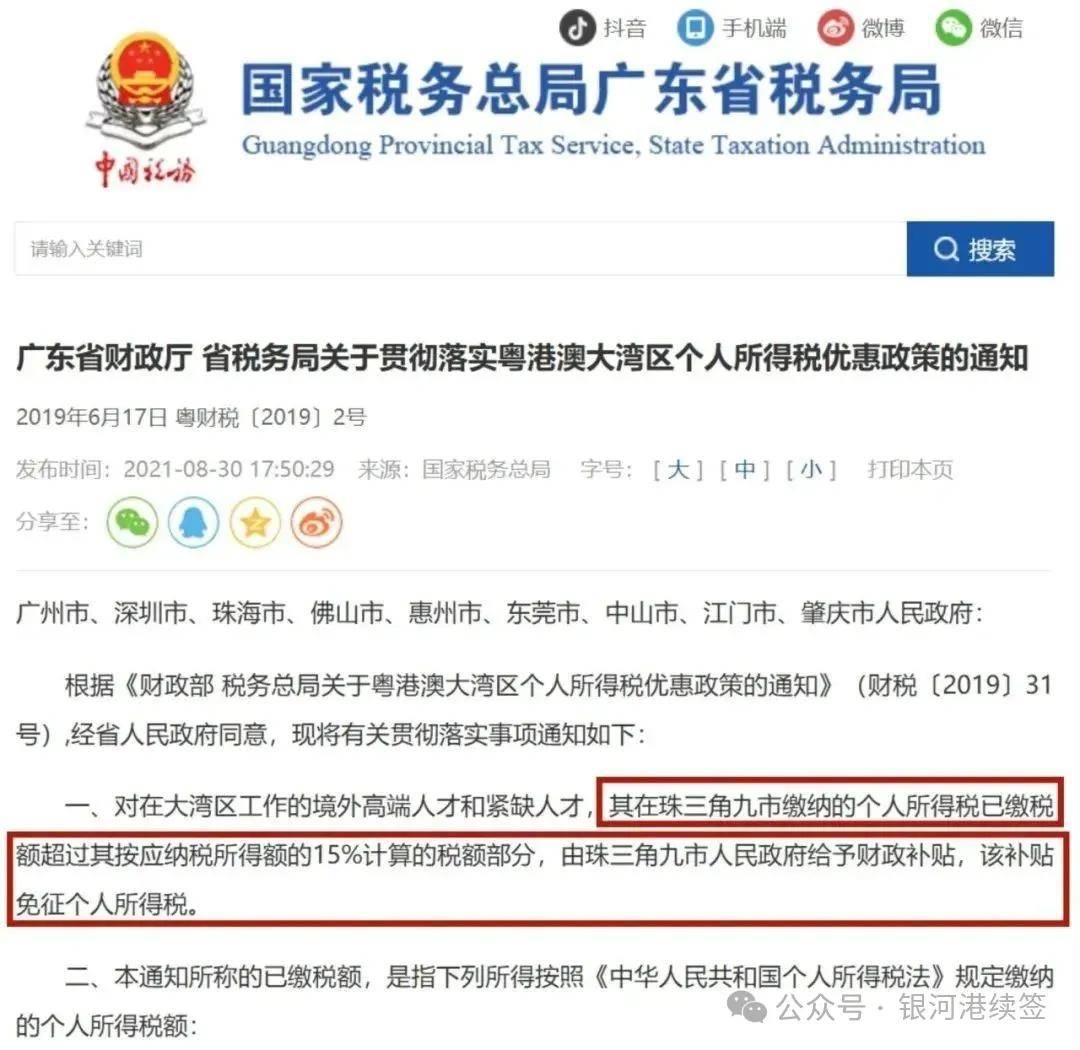 从2019年开始,广州、深圳等九个城市对符合条件的境外人才(包括香港永久居民和通过优才、专才等计划拿到香港身份的人),个税税率超过 15% 的部分,政府会把多交的钱补回来,每年最多能补500万。该政策将持续实施至2027年12月31日。