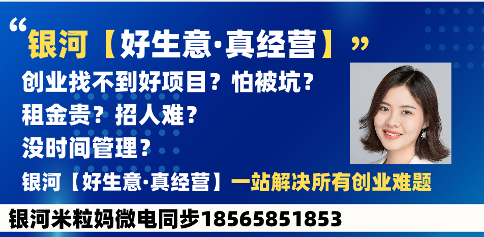 如果你想要创业自雇续签优才,但遇到各种困难,可以了解一下银河【好生意·真经营】全链条服务,可以一站解决租金贵、招人难、没时间管理、不了解市场等各种难题,详细可以咨询银河米粒妈(18565851853& 17675416895)