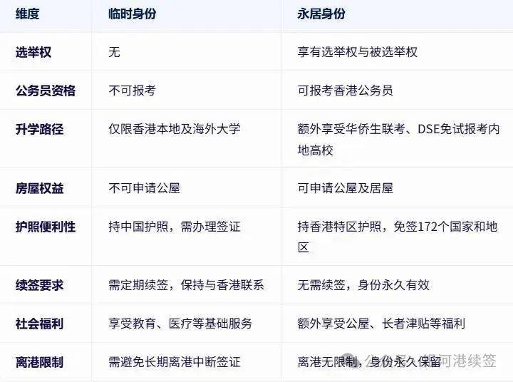 非永居身份:无法报考香港公务员职位,也无法担任部分需要永居身份的政府职位。