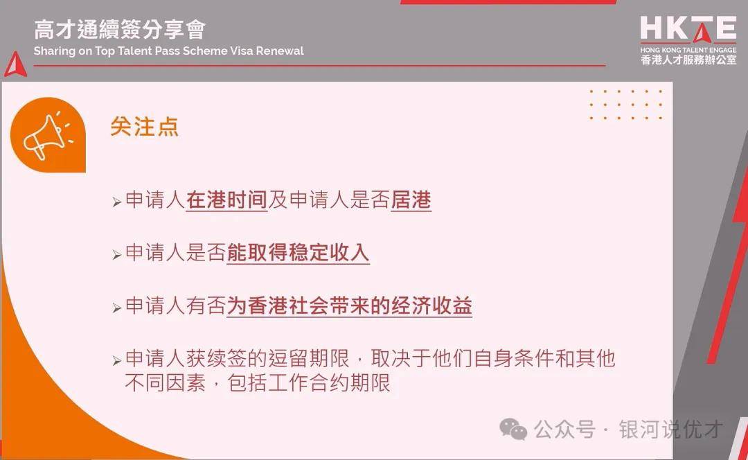 需要注意的是,高才通续签条件虽然只明确了在港工作要求,但实际审批中,入境处还会关注4个要点,以此批出续签时长,比如几个月、1年、2年、3年、6年。