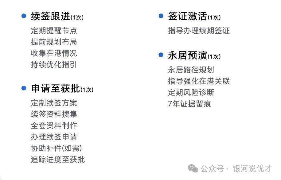 而银河集团有大量续签案例和市场调研,对于香港创业续签有完整的方案,提供香港身份一站式续签产品,可根据客户续签时间连贯性来做全套落地方案(如什么时候注册公司、缴纳强积金、发薪等),真正做到真实合规(哪些是强关联、足额的纳税贡献是多少)等,让你全程无忧,可根据自己不同续签需求来选择创业产品。