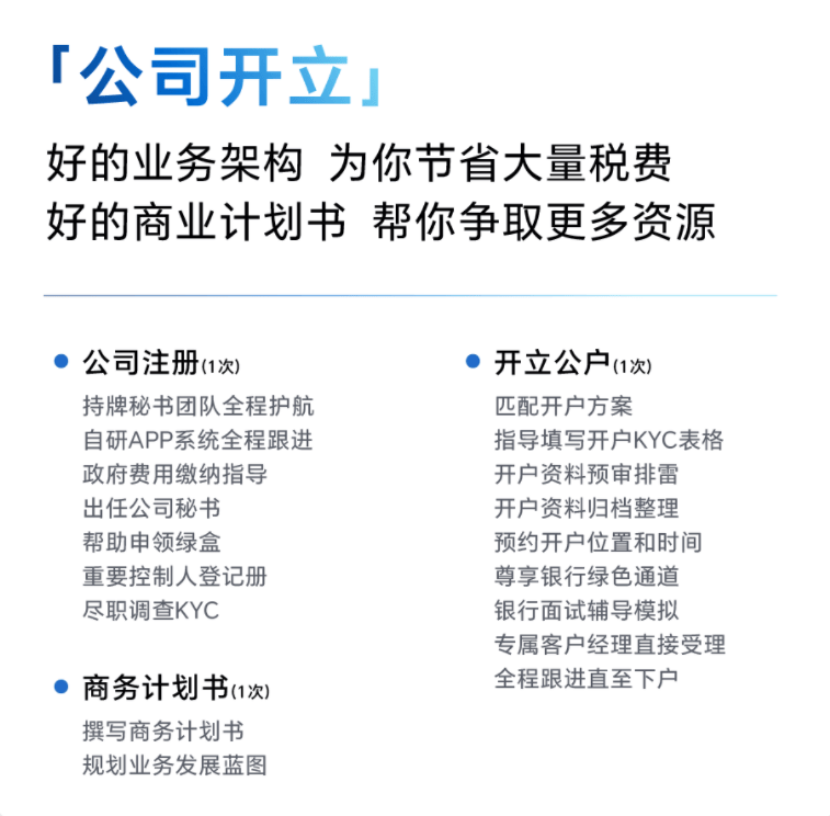 2、公司开立:通过精心设计好的业务架构助您合法节省大量税费,同时量身定制高质量的商业计划书,为您精准对接资源、高效争取多方支持。具体服务包括公司注册、商务计划书、开立公户。