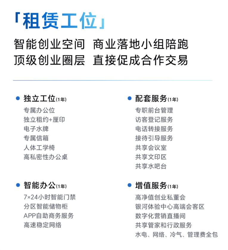 1、租赁工位:坐落于智能创业空间内,不仅配备完善的办公设施,更有商业落地小组全程陪跑助力,让您置身于顶级创业圈层之中,轻松拓展人脉资源,直接促成各类合作交易。具体包括:独立工位、配套服务、智能办公及增值服务。