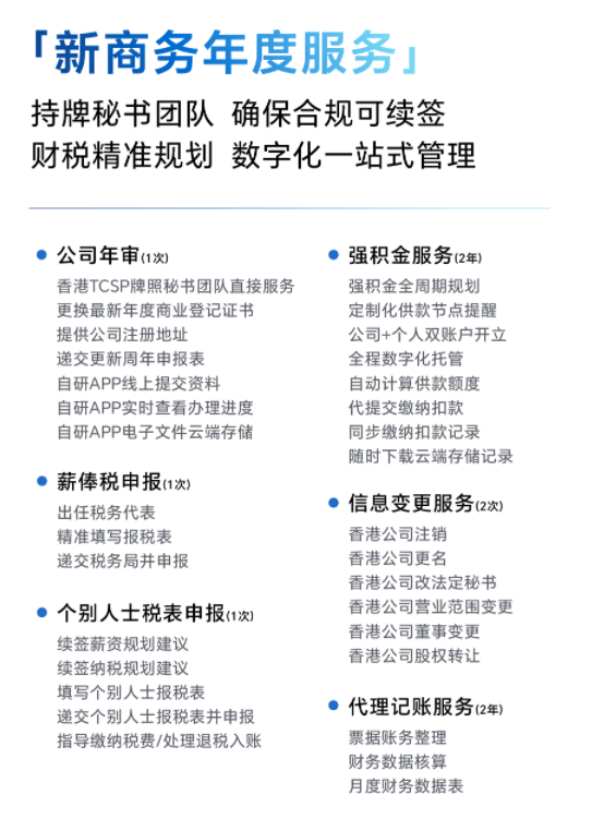 3、新商务服务年度:配备专业持牌秘书团队全程跟进,为企业提供从合规审查到续签指导的一站式保障,同时结合财税精准规划方案与数字化管理系统,助力企业实现高效运营与可持续发展。