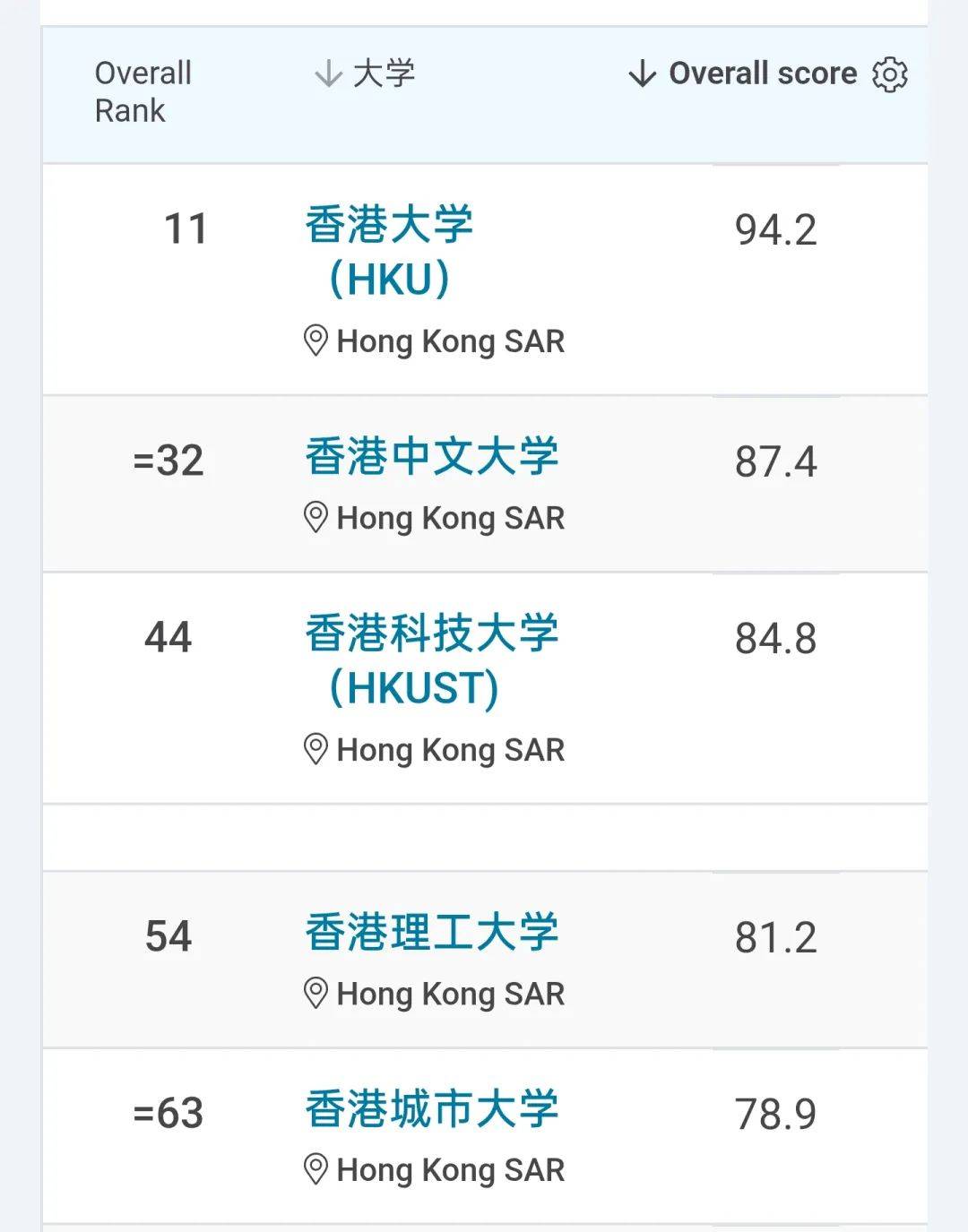 在全球各大百强名校排行榜中,香港总共有5所大学上榜,分别是香港大学、香港中文大学、香港科技大学、香港城市大学和香港理工大学,是全世界百强大学数量最多的城市。