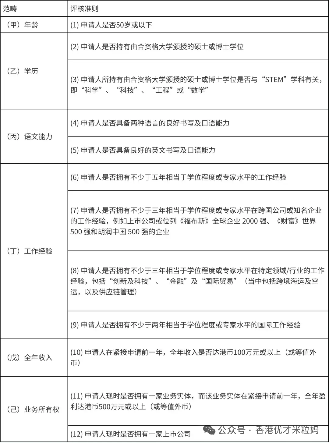 更直接了,要求也更高了。很多精英用原来的计分制还能够上申请门槛,现在的12项,压根没办法满足6项……以前的打分制,只要名校毕业,大厂工作,想通过优才带娃到香港读书不要太简单。