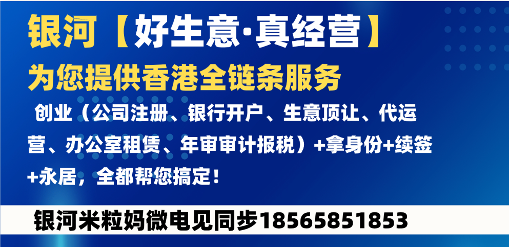 银河集团香港身份办理、创业和续签都找银河集团,从香港身份办理、选项目、收购店铺、租赁办公室、到后期招人、商务服务、公司代理运营管理,续签和永居手续办理, 银河集团全都帮您搞定。选银河不仅是选一个服务机构,更是选一个懂香港、懂创业、懂续签的长期伙伴!银河【好生意·真经营】=身份到手+创业成功+顺利续签转永居。想要了解银河集团【好生意·真经营】项目可以加银河米粒妈微信详细沟通(18565851853&17675416895)