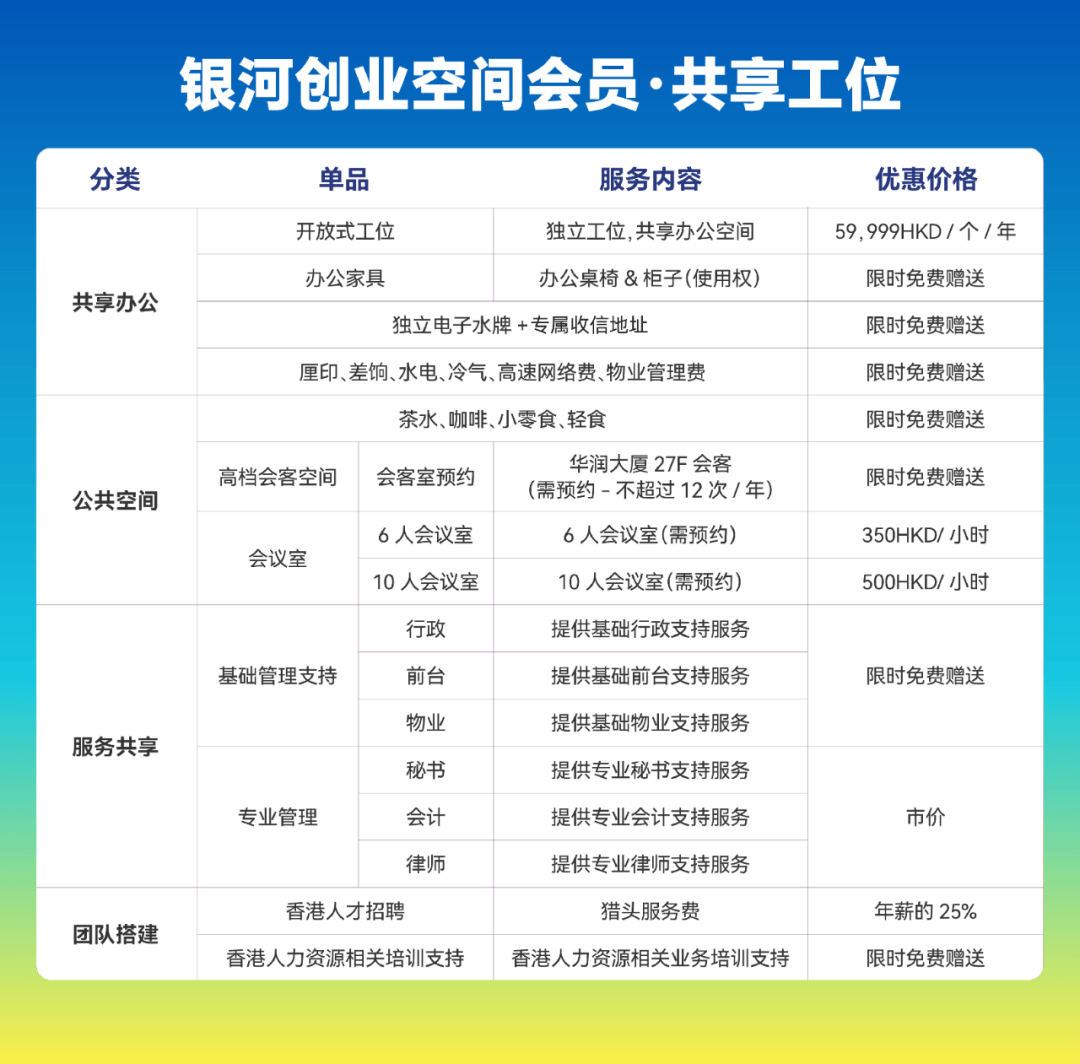 共享资源降本:免费提供五星级前台、行政、会计、法务服务,年节省人力成本超15万港元。以中环甲级写字楼为例,同等规模团队自行雇佣行政人员年支出约18万港元,而银河空间仅需3万港元。