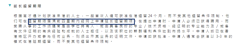 如果申请人已根据高才通计划在香港逗留满两年,且上一评税年度的薪俸税应评税入息达港币200万元或以上,可申请根据顶尖人才类别延长逗留期限,成功后可获准延期逗留6年。