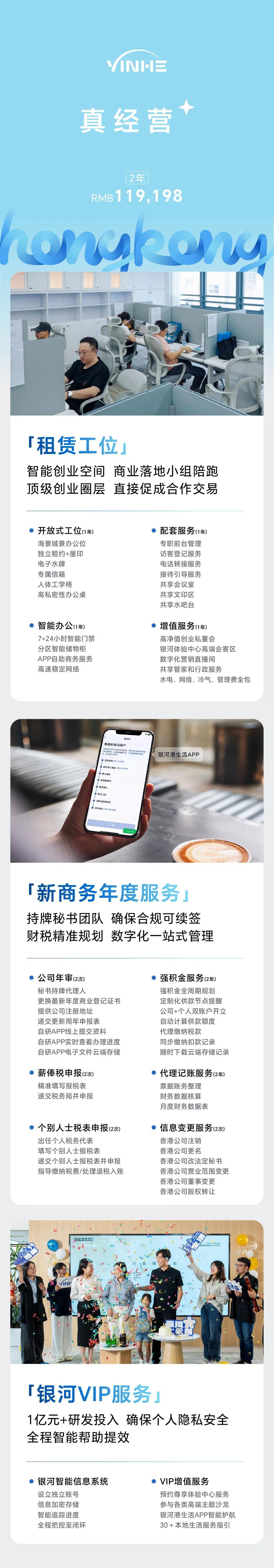 以银河集团的“真经营基础版”服务产品为例,公司开立、商务服务、工位租赁、VIP增值四方面服务,让你在香港创业更简单!