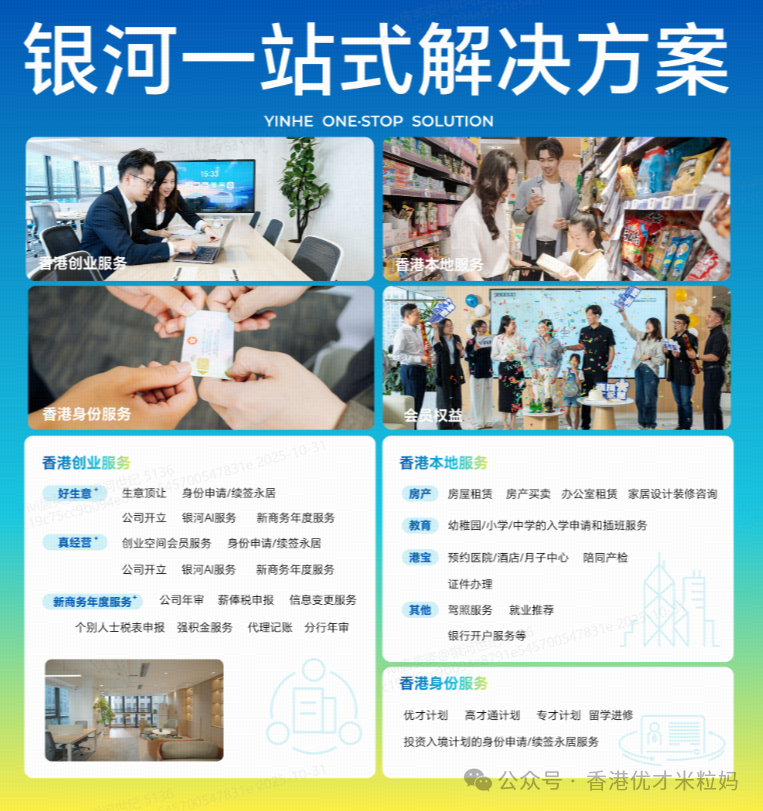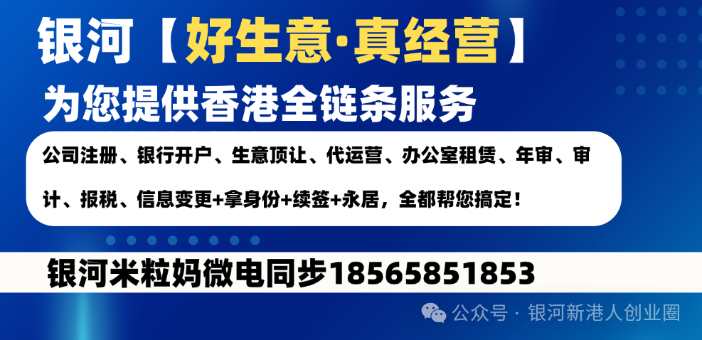 银河【好生意·真经营】提供香港创业和身份全链条专业服务。为您在港发展与身份规划全程护航。无论您处于哪个阶段,遇到何种问题,银河集团一站式为您解决。欢迎添加银河米粒妈咨询,量身定制您的专属方案。微信号/电话:18565851853 &17675416895