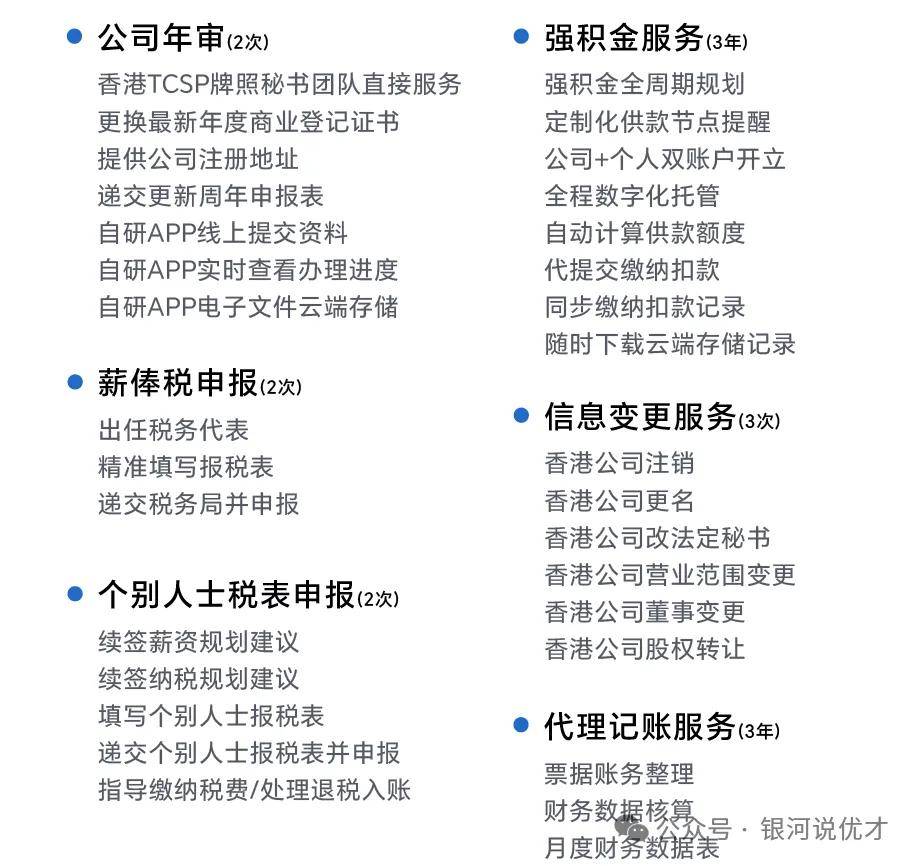 包括公司年审、强积金服务、薪俸税申报、信息变更服务、个别人士税表申报、代理记账服务等。