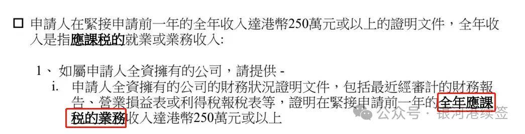 而入境处是把 “应课税的”放在了“就业或业务收入”的前面,也就是说你想通过A类申请高才通,填报的收入得是向税务局报了税的,入境处才认可。这就需要申请人提供个人所得税纳税记录或完税证明,还有公司出具的收入证明文件,证明收入达到港币250万元或以上。
