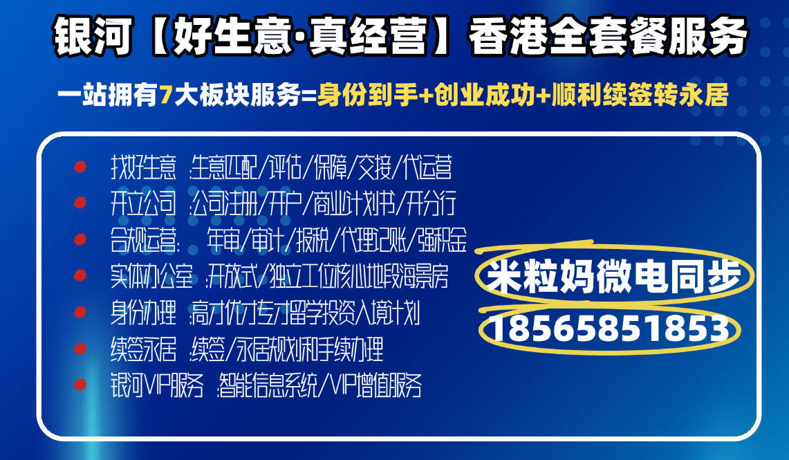 香港身份办理、创业和续签都找银河集团,从香港身份办理、选项目、收购店铺、租赁办公室、到后期招人、商务服务、公司代理运营管理,续签和永居手续办理, 银河集团全都帮您搞定。选银河不仅是选一个服务机构,更是选一个懂香港、懂创业、懂续签的长期伙伴!银河【好生意·真经营】=身份到手+创业成功+顺利续签转永居。想要了解银河集团【好生意·真经营】项目可以加银河米粒妈微信详细沟通(18565851853&17675416895)