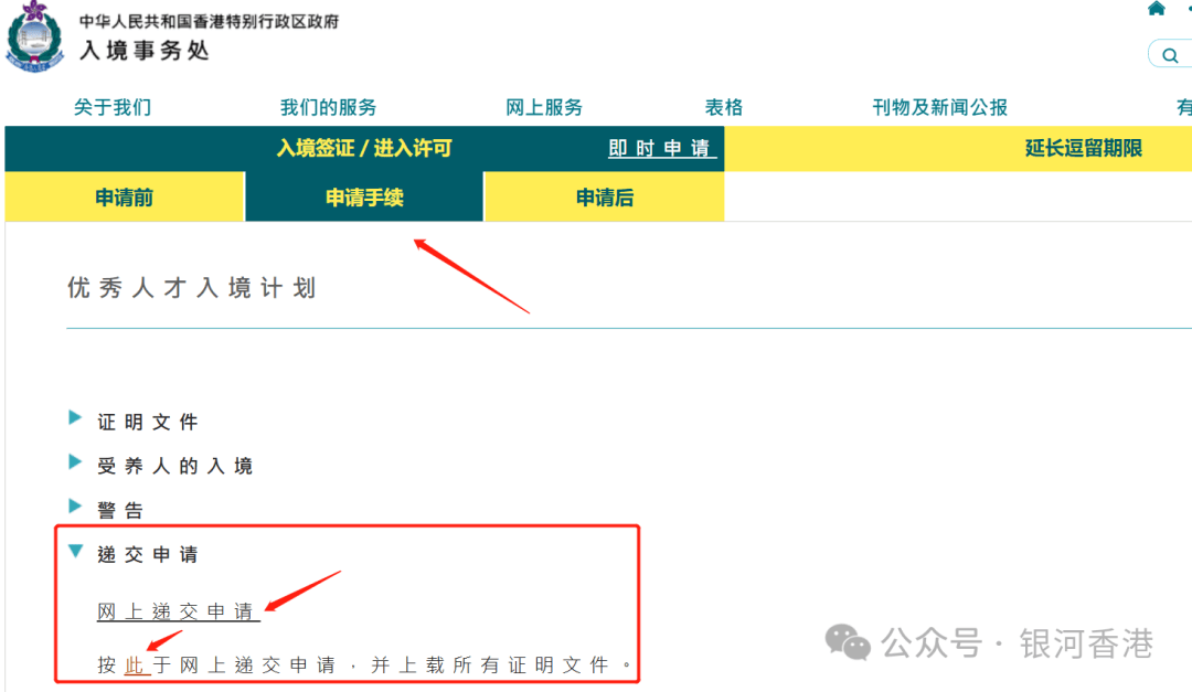 准备好香港优才的申请材料后,就可以到网上递交申请了,优才计划申请网址可以在入境处官网找到,一般【入境签证/进入许可】可以找到优才相关内容。
