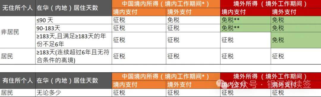 “在华居住人士的个税的应征/免征”此表这其中涉及到2个重要概念。理解了这两个概念,无论有什么变化,大家都可以参照此表。