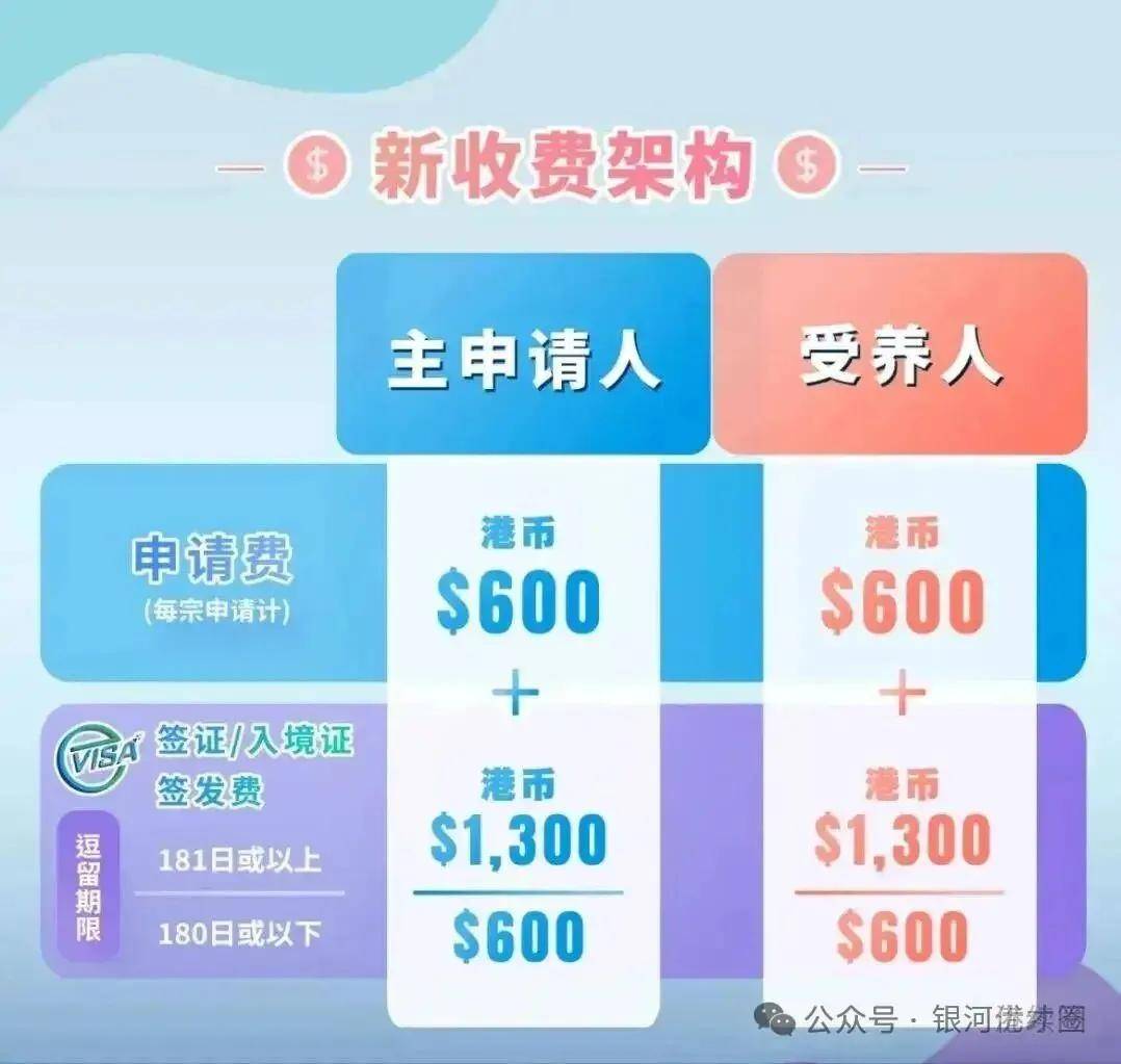 2025年2月26日起提交的初次或续签申请要收费,获批后需要缴纳的签证费用也根据签证期限分两级收费。不管是主申请还是受养人,申请即交600元,签证费按天计算,180天内=600港元/人次,超180天=1300港元/人次。
