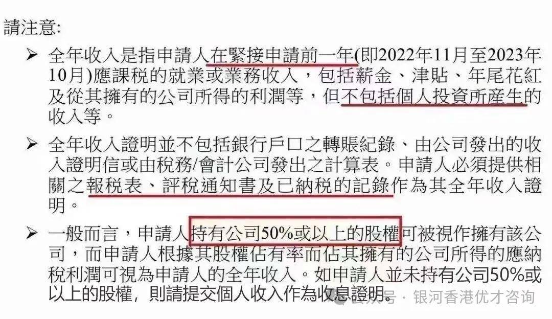 2、全年收入要求:是指应课税的就业或业务收入,包括薪金、津贴、股票期权及从其拥有的公司所得的利润。个人投资类收入(如炒股、基金买卖、卖房、存款、自雇公司给自己转账等)不被认可。