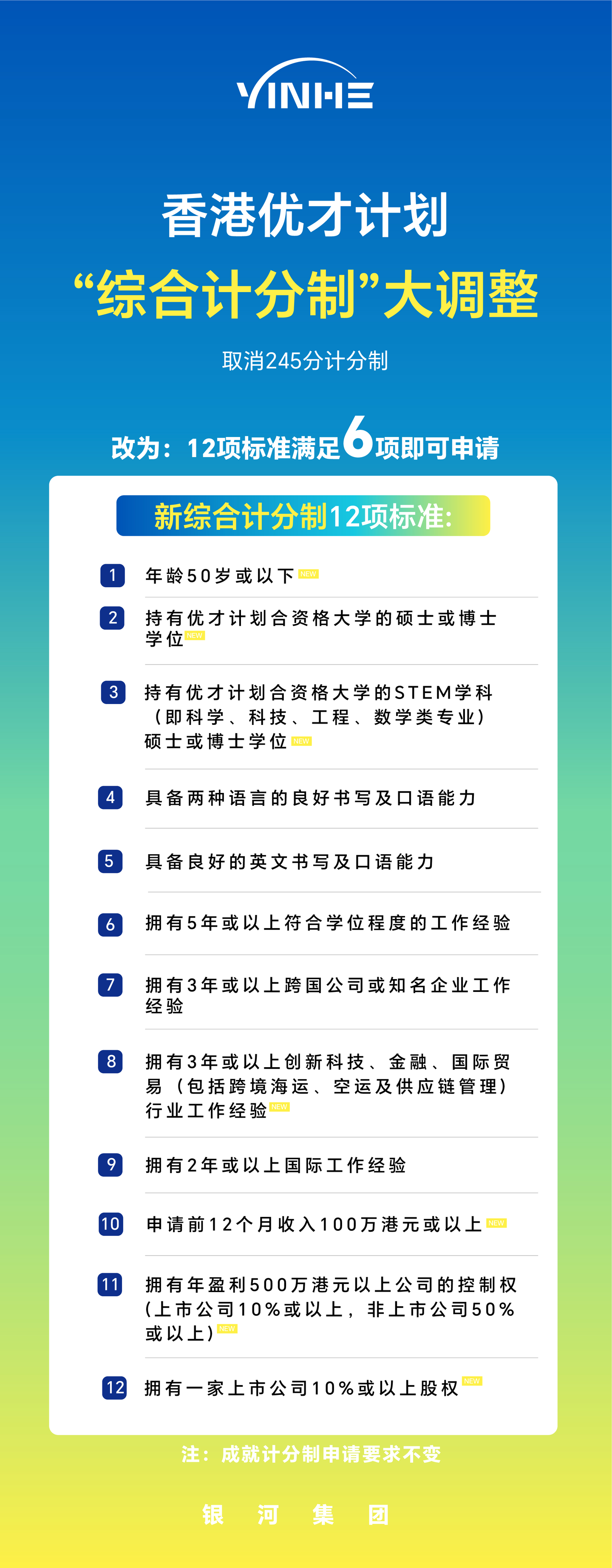 2)选择合适计分制度★成就计分制:适用于具备超凡才能或技术并拥有杰出成就的个别人士,例如奥运奖牌、诺贝尔奖、国家/国际奖项)或获业内颁发终身成就奖的杰出人才 ★综合计分制:新版香港优才计划综合计分表,一共6个维度,12条标准,需要满足6条,才具备申请资格,比较适合名校硕博毕业、有丰富工作经验、精通外语的高收入人群、高管、企业老板等!