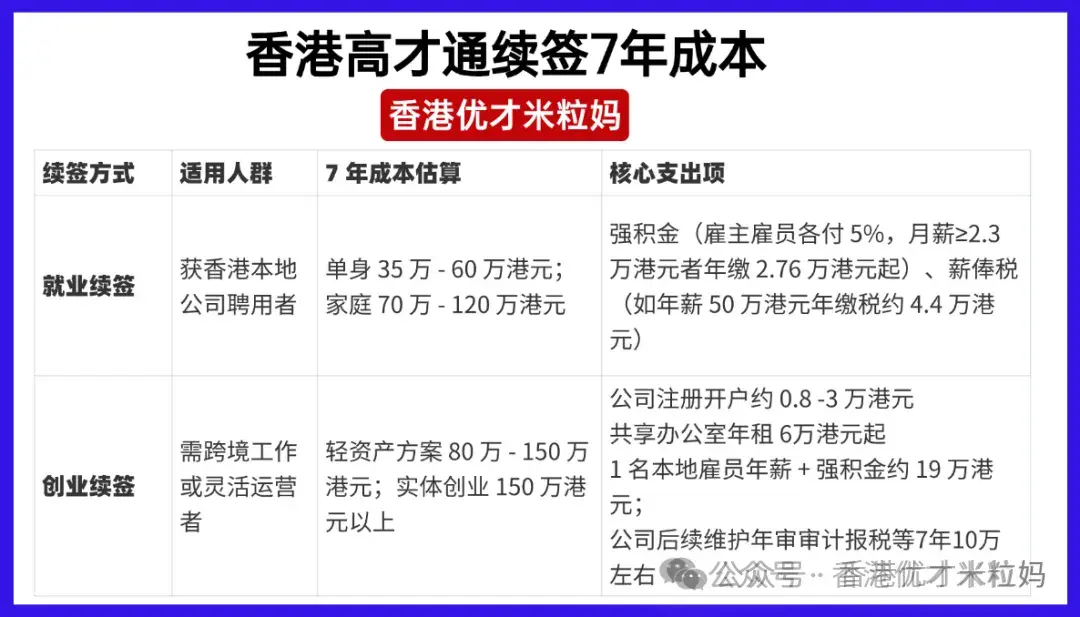 香港高才通续签转永居的 7 年费用无固定标准,核心取决于续签模式、在港生活方式及家庭情况,主要涵盖官方签证费、续签关联成本(受雇 / 自雇 / 灵活关联)、生活教育等刚性支出,2025 年政策调整后官方费用有所上调,以下是详细拆解: