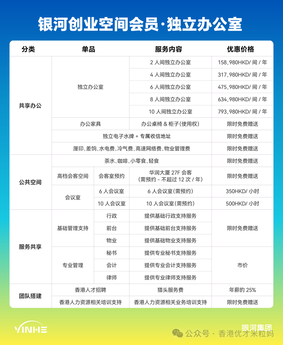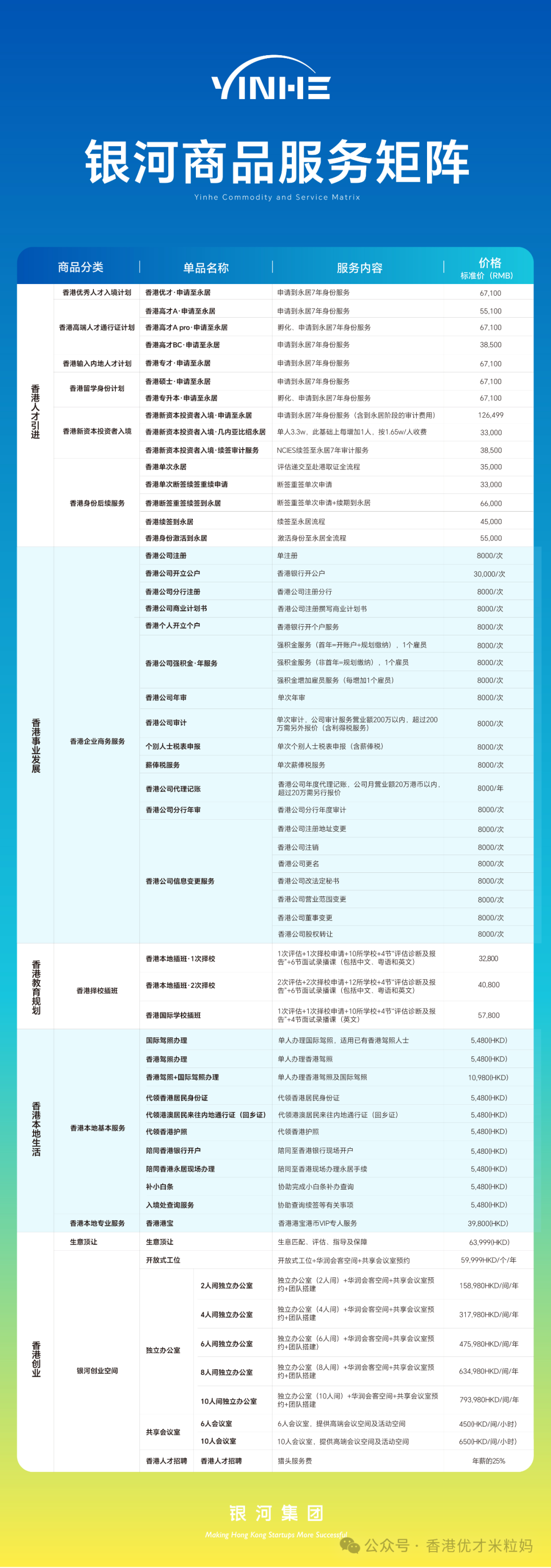 银河集团商品服务矩阵,可以提供套餐和单项服务,买套餐更划算!(香港身份、香港事业发展、香港生活、子女教育、银河共享工位,你想要的服务都在这里, 具体可以找银河米粒妈咨询18565851853)