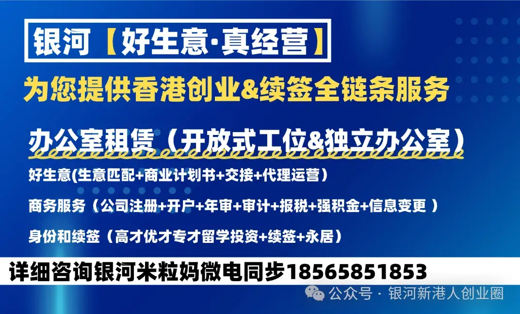 银河集团有一站式香港业务解决方案,包括不限于共享办公室租赁,关于香港创业和续签您遇到任何问题都可以DD银河米粒妈,米粒妈微电同步18565851853 & 17675416895